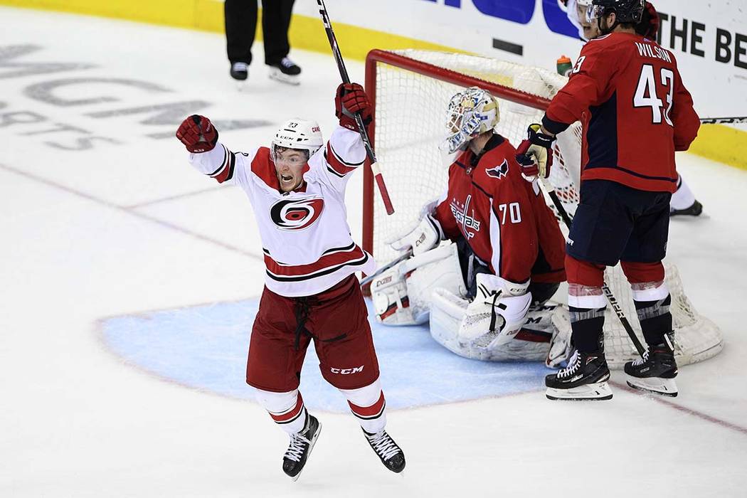 Carolina Hurricanes Center Sebastian Aho (20) Scores A Goal Against The Buffalo Sabres During.